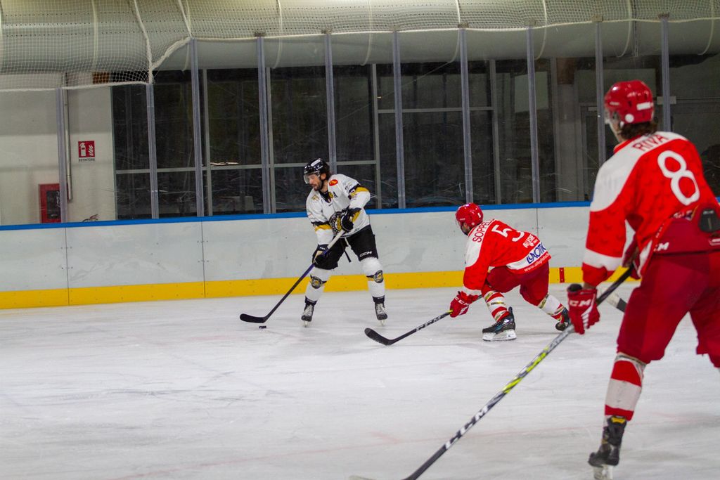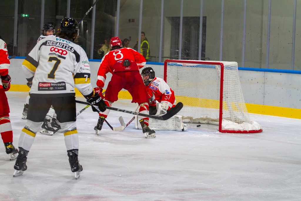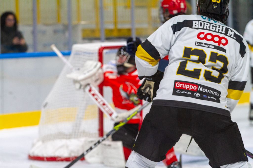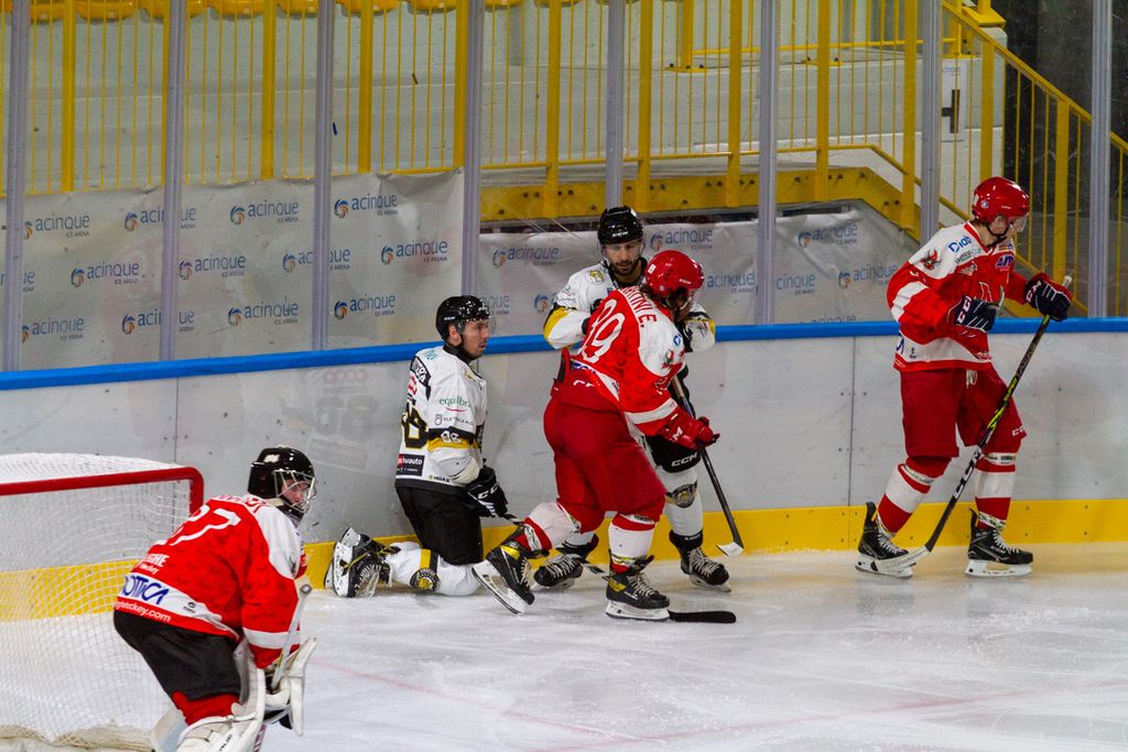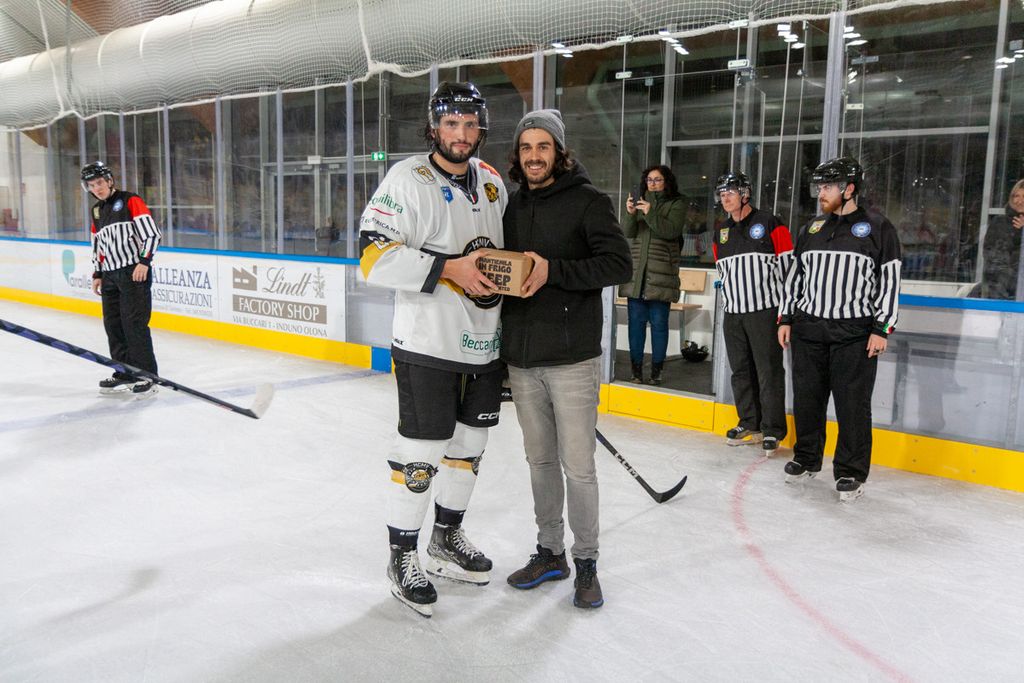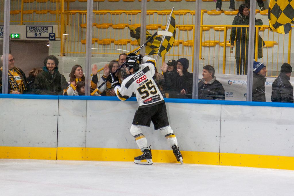 Favoloso 4-0 al volo di Cordiano sotto la traversa su assist ancora più bello di Franchini: palaghiaccio in estasi anche per la fucilata del 5-1 di Marcello Borghi, Mvp della serata, e per il 6-1 di Edo Raimondi, il gol che per noi conta di più per mille motivi.