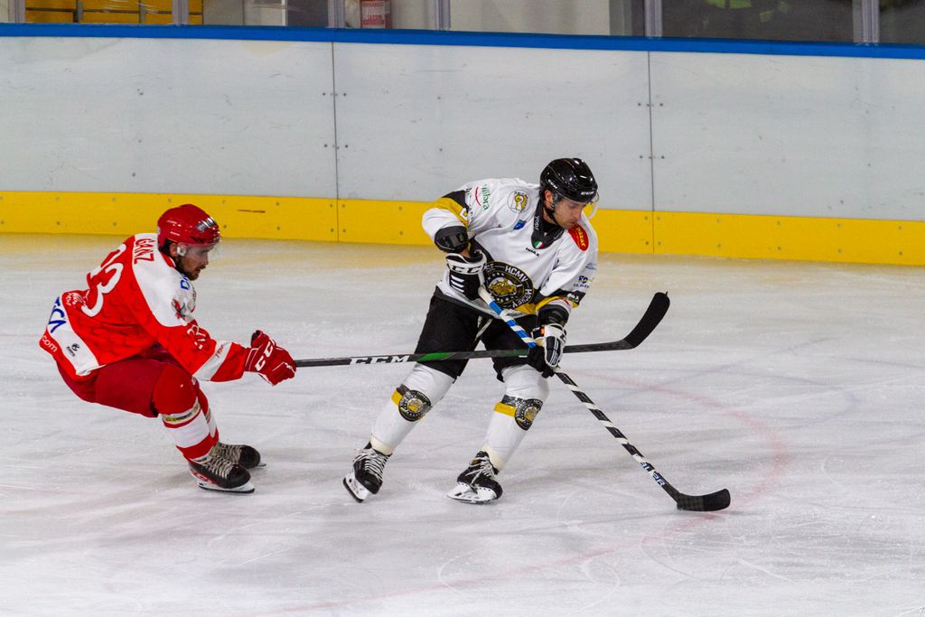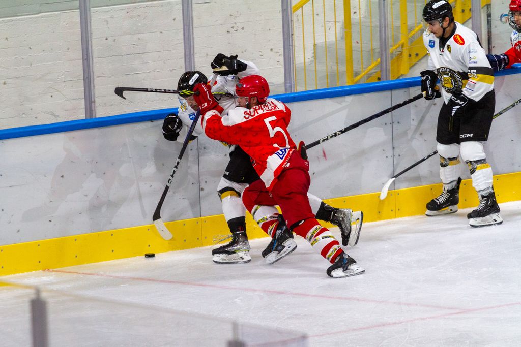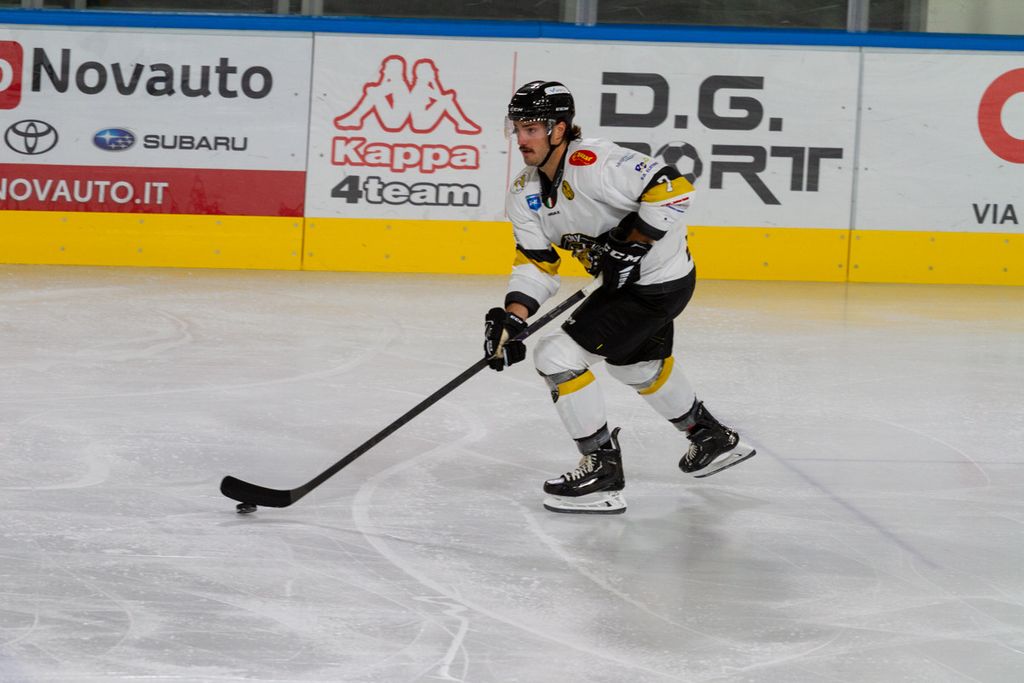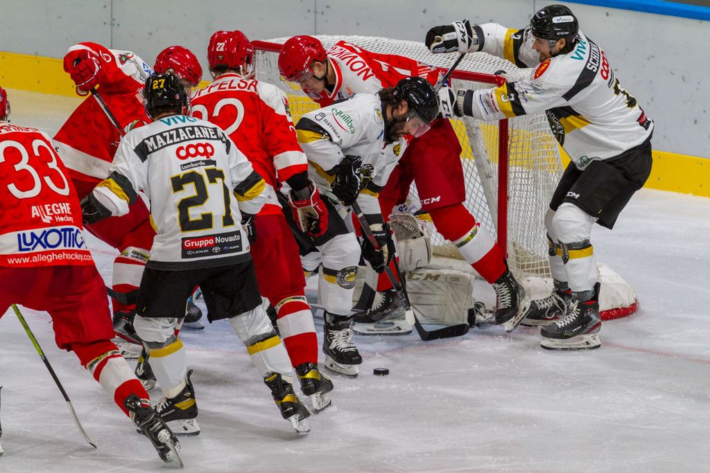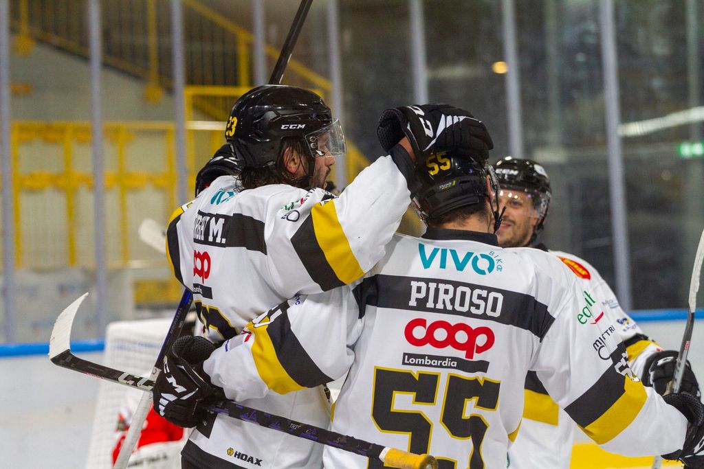 Partita praticamente finita dopo 42 secondi, al di là del rilassamento di cui vi abbiamo detto, sulla zampata vincente su rimbalzo di Michael Mazzacane dopo sventola di Drolet (1-0) prima che Piroso davanti alla porta dopo un’azione corale della prima linea mettesse sotto i gambali del portiere il 2-0. Era poi un'invenzione del mago Franchini a fare riapparire il disco del 3-0 in fondo alla gabbia e a costringere all’8’29”, sul 3-0 giallonero, gli ospiti a chiedere time out.