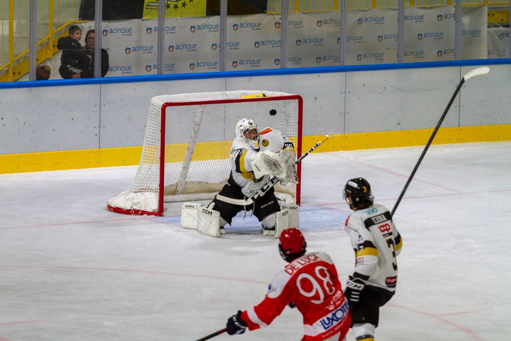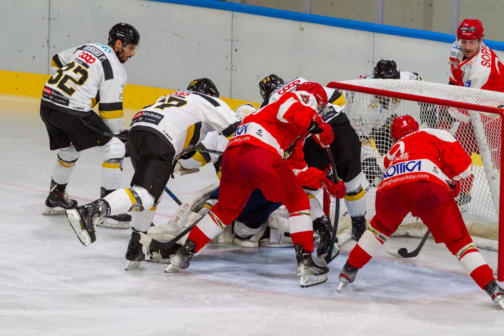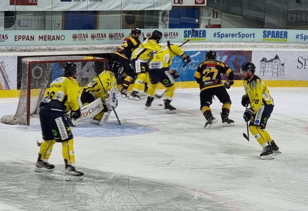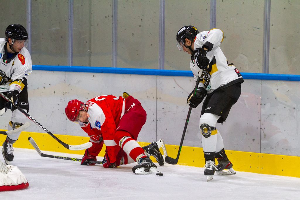 Partita praticamente finita dopo 42 secondi, al di là del rilassamento di cui vi abbiamo detto, sulla zampata vincente su rimbalzo di Michael Mazzacane dopo sventola di Drolet (1-0) prima che Piroso davanti alla porta dopo un’azione corale della prima linea mettesse sotto i gambali del portiere il 2-0. Era poi un'invenzione del mago Franchini a fare riapparire il disco del 3-0 in fondo alla gabbia e a costringere all’8’29”, sul 3-0 giallonero, gli ospiti a chiedere time out.