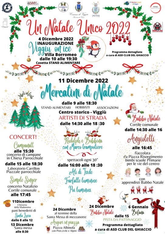 Il via alle iniziative nel periodo di avvicinamento al Natale sarà dato il 4 dicembre con Viggiù On Ice, ovvero l’apertura, anche quest’anno, della pista di ghiaccio nel parco di Villa Borromeo. L’inaugurazione sarà alle 10, e la pista rimarrà aperta fino all’8 gennaio 2023. In questo periodo, la mattina sarà a disposizione delle scuole per lezioni di pattinaggio, mentre il pomeriggio e la sera sarà aperta per il divertimento di tutti quanti.