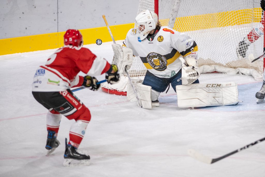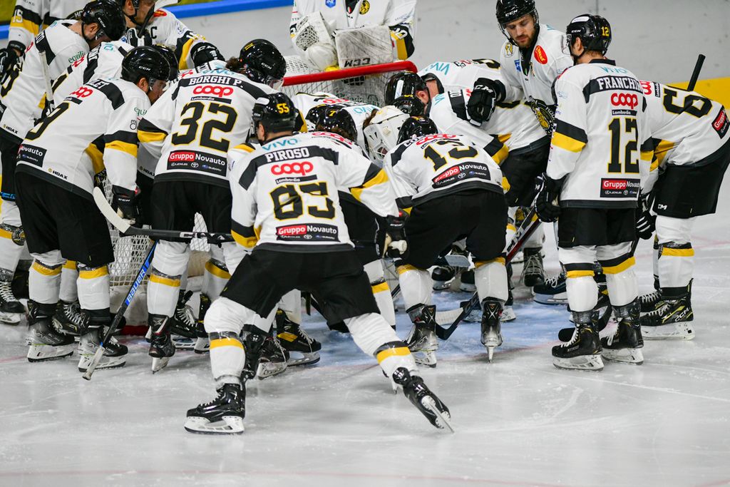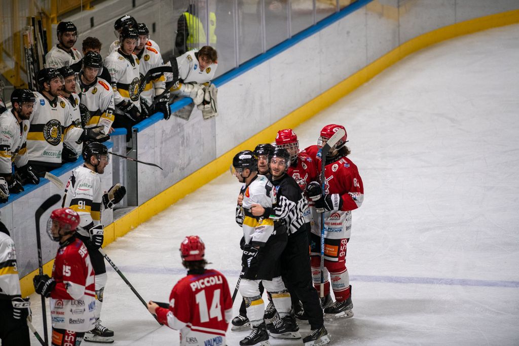 Era stato l'1-0 che sbloccava il match: poi verrà il raddoppio di Franchini su rimbalzo, il tris di Tilaro con discesa libera e cannonata nel secondo periodo. Quindi, ecco il momento decisivo: a 13 secondi dalla seconda sirena, dopo il calo giallonero, l'uomo decisivo dei momenti decisivi, alias Francis Drolet, saliva in cattedra con il 4-1 che mandava tutti a sfiorare il cielo e il primo posto di questo campionato senza padroni (le prime cinque della classifica sono racchiuse in un fazzoletto di 4 punti).