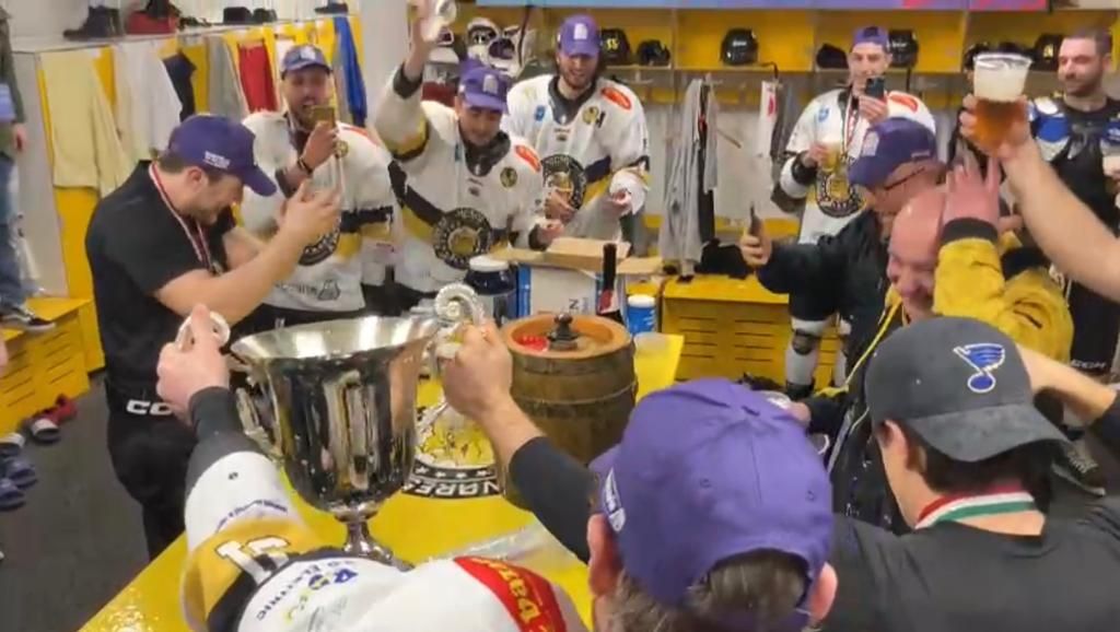 Là dove è nato tutto, nello spogliatoio sotto la tribuna del palaghiaccio, i Mastini sono rientrati trionfanti dopo la "sbronza" di gioia sul ghiaccio, in mezzo alla gente impazzita scesa in pista insieme agli eroi gialloneri. Per una volta, siamo entrati anche noi nello stanzone che custodisce i segreti della squadra, che ha brindato nella grande coppa, cantato i cori storici della curva giallonera e chiesto di parlare a Rocco Perla, il portierone protagonista di parate superlative sia in semifinale che in finale.