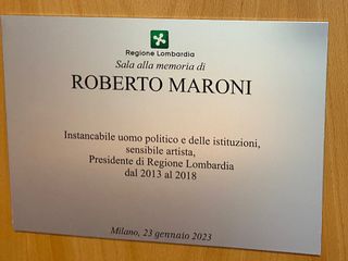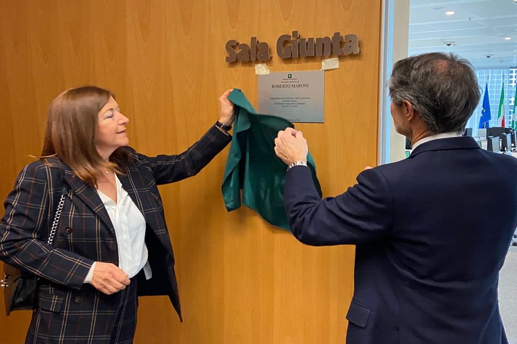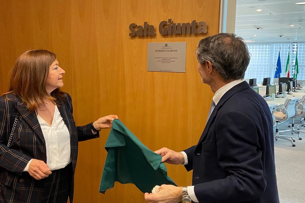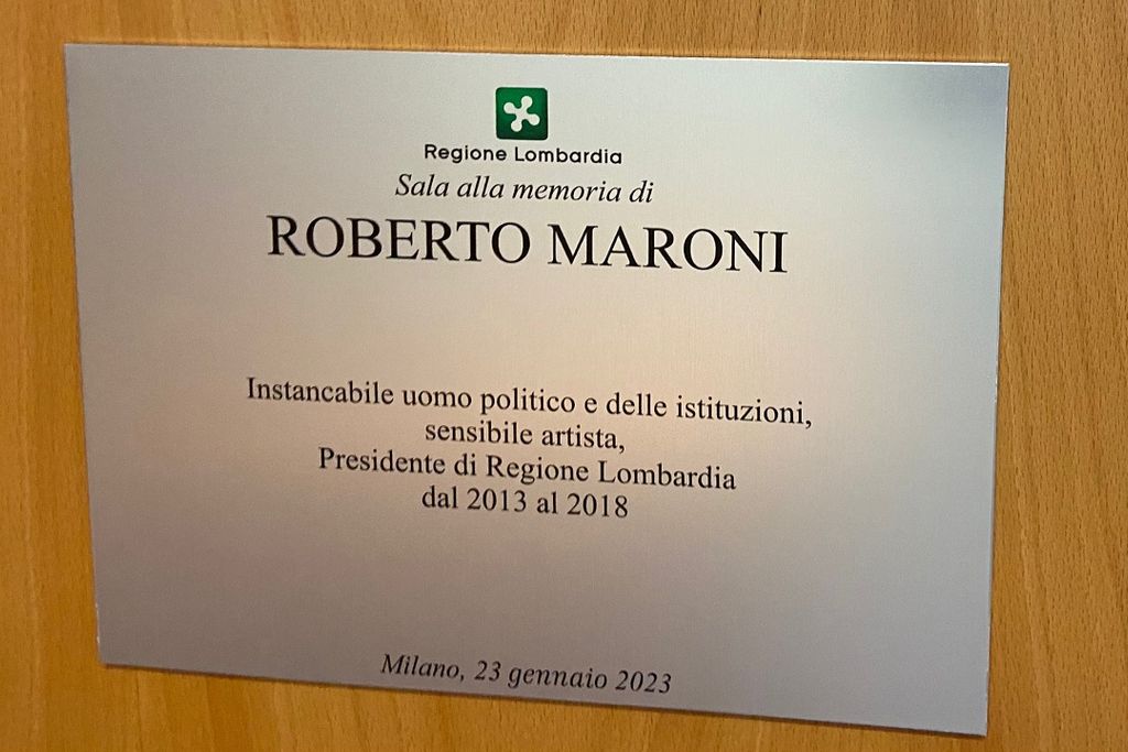 «Instancabile uomo politico e delle istituzioni, sensibile artista, Presidente di Regione Lombardia dal 2013 al 2018». È il testo della targa svelata oggi al 13° piano di Palazzo Lombardia, sede della Regione, per l'intitolazione formale della 'Sala Giunta' a Roberto Maroni. Erano presenti la moglie Emilia, la figlia Chelo e la sorella Enza, oltre ai rappresentanti della Giunta e a persone vicine a Roberto Maroni.