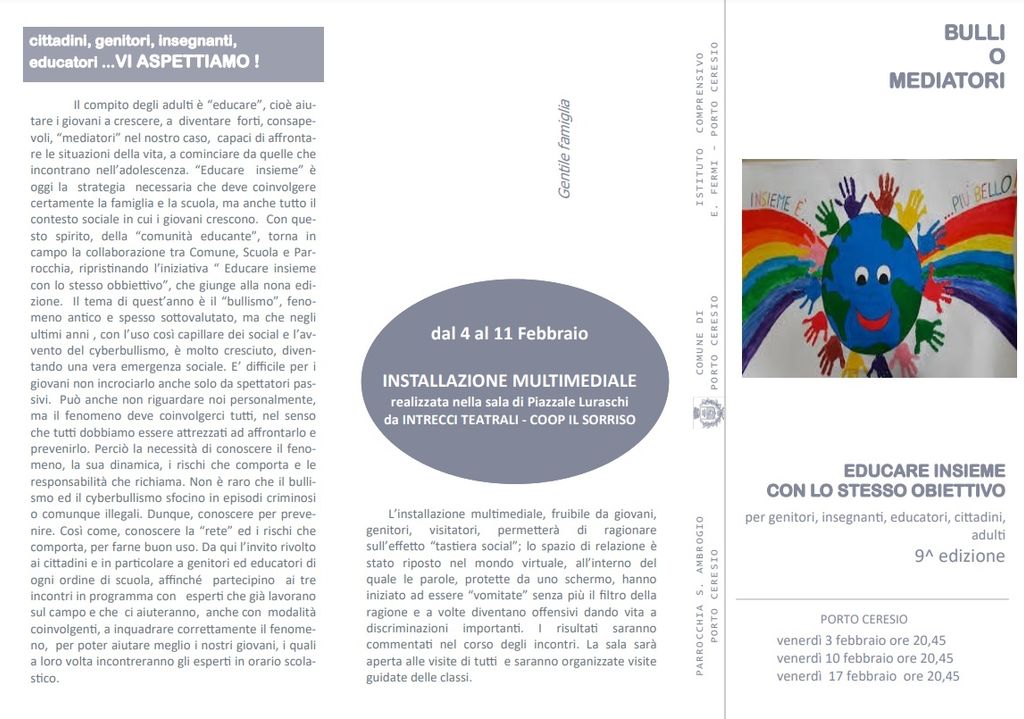 Si svolgeranno prossimamente a Porto Ceresio tre incontri pubblici sul bullismo, nell’ambito del progetto Educare insieme con lo stesso obbiettivo, che coinvolge il Comune con gli assessorati all’Istruzione e ai Servizi Sociali, l’Istituto Comprensivo E. Fermi e la Parrocchia S. Ambrogio.