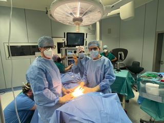 Alla console, il Dott. Andrea Rizzi, Direttore della Chirurgia generale di Tradate, oltre che del Dipartimento di Area Chirurgica, accompagnato dal suo collaboratore, anche lui specialista della Chirurgia del Galmarini, il Dott. Luca Broggi, dalla strumentista Gabriella Gabrielli, dalle nurse Tiziana Grati e Nicolo’ Di Lorenzo, e dalle OSS Tiziana Rigoli e Monica Tiberti, oltre che dagli anestesisti Luca Guzzetti e Luca Botta primario del servizio di Anestesia e Rianimazione di Tradate.