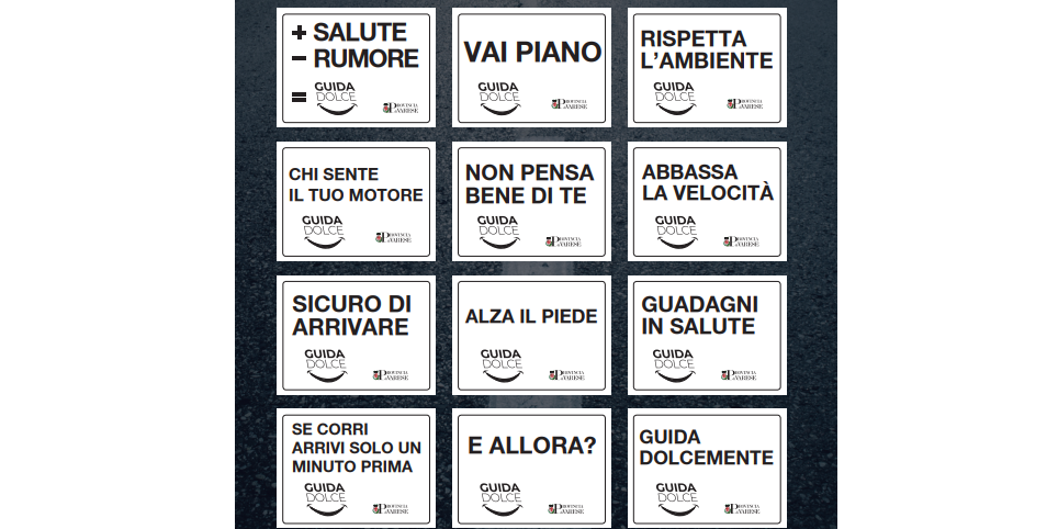 I cartelli a favore della guida dolce sono stati installati in corrispondenza delle rotatorie e recano messaggi come “GUIDA DOLCEMENTE”, “+SALUTE –RUMORE”, “SE CORRI ARRIVI SOLO UN MINUTO PRIMA”, “CHI SENTE IL TUO RUMORE NON PENSA BENE DI TE, “VAI PIANO”, “RISPETTA L'AMBIENTE”.