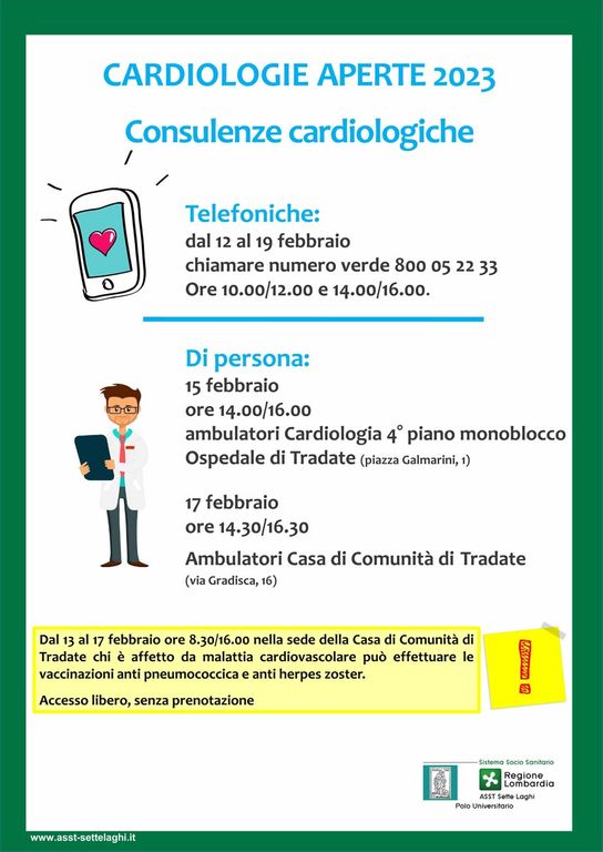 Consulenze cardiologiche, al telefono (chiamare numero verde 800 05 22 33 dalle ore 10 alle 12 e dalle 14 alle 16) o di persona (15 febbraio ore 14.00/16.00 ambulatori Cardiologia 4° piano monoblocco Ospedale di Tradate, piazza Galmarini 1; 17 febbraio ore 14.30/16.30 Ambulatori Casa di Comunità di Tradate, via Gradisca 16).