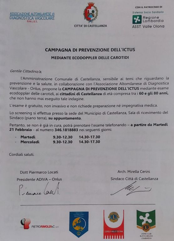 Grazie alla sinergia tra alcuni dei Lions Club del territorio, l’azienda Pietro Rimoldi e l’associazione Altomilanese di diagnostica vascolare, nelle prossime settimane a Castellanza prenderà il via una campagna di screening rivolta a tutti i residenti tra i 60 e gli 80 anni.