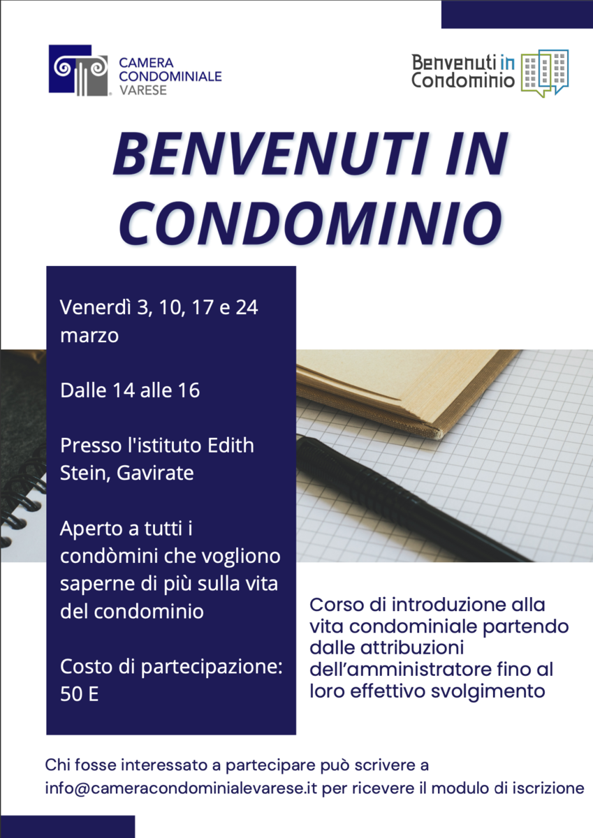 Camera Condominiale Varese, associazione varesina che riunisce gli amministratori di condominio del territorio e non solo, darà il via il 3 marzo a una formazione che si rivolge a chi abita in condomino, composta da 4 incontri, il venerdì dalle ore 14.00 alle 16.00, presso l’Istituto Edith Stein di Gavirate.