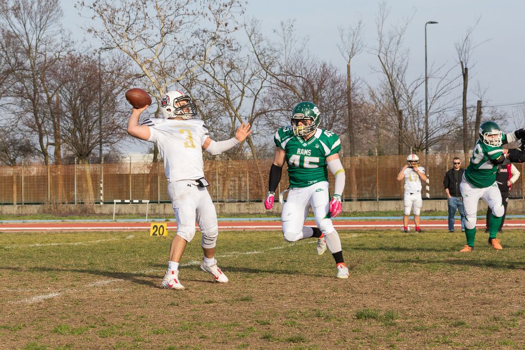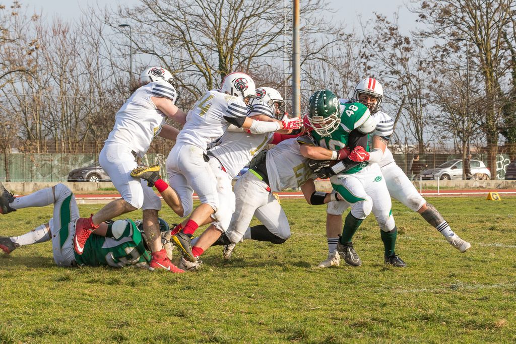 Il match è iniziato con gli arieti milanesi che sbattono contro la difesa biancorossa e sono costretti al field goal.