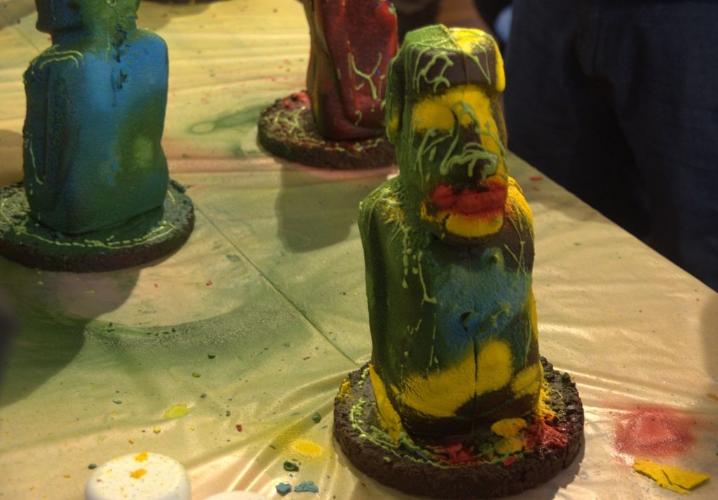 Così, alle 15 è iniziato ufficialmente quello che Paola ha definito ridendo il Colour Party: tutti i ragazzi, disposti ai vari tavoli, hanno decorato i MOAI, l'aria ricca di polvere colorata, di risate, di orgoglio e di soddisfazione nell'aver realizzato, insieme, questo importante progetto.