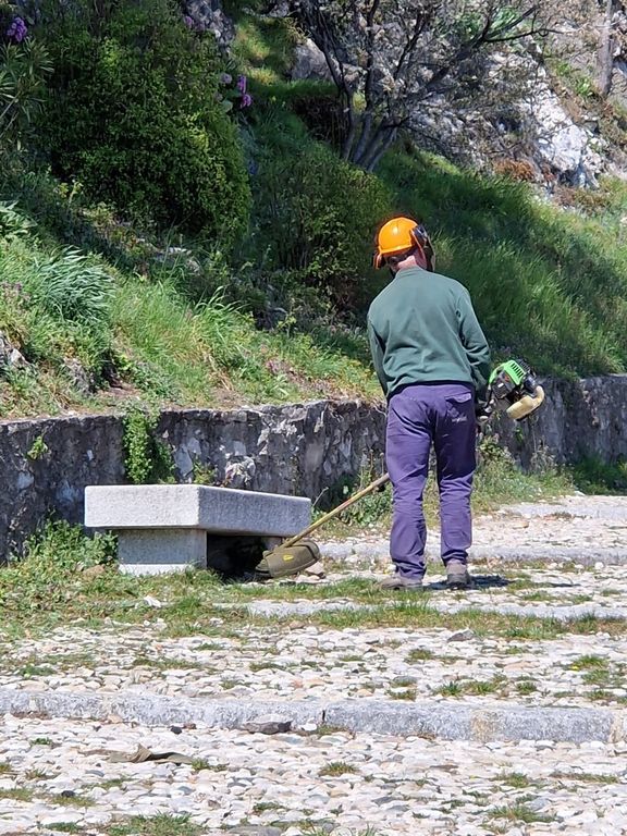 Tuo? Mio? Suo? No, di tutti: ecco i volontari senior del Cai oggi in azione sul viale delle Cappelle che conduce al Sacro Monte per tagliare erba e raccogliere foglie