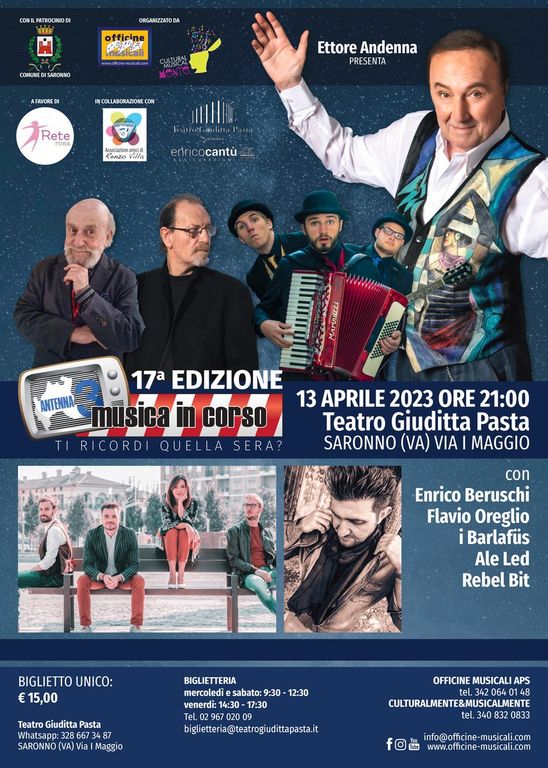 Gli eventi dedicati ad Antenna 3 avranno anche uno straordinario ed imperdibile prologo giovedì 13 aprile alle ore 21:00 c/o il Teatro Giuditta Pasta di Saronno con la XVII edizione di “Musica in Corso”.