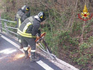FOTO. Luino, perde il controllo dell'auto e finisce contro una barriera di protezione rimanendo in bilico: soccorso anche un bimbo di 4 anni