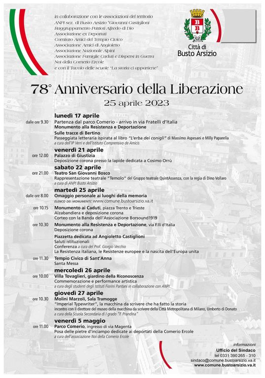 L'Amministrazione comunale, in collaborazione con le associazioni del territorio (Anpi sezione di Busto Arsizio Giovanni Castiglioni, Raggruppamento Patrioti Alfredo di Dio, Associazione ex Deportati, Comitato Amici del Tempio Civico, Associazione Amici di Angioletto, Associazione Nazionale Alpini, Associazione Famiglie Caduti e Dispersi in Guerra, Noi della Comerio Ercole e con il Tavolo delle scuole “La storia ci appartiene”) celebra il 78° anniversario della Liberazione.