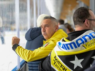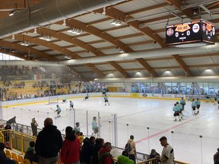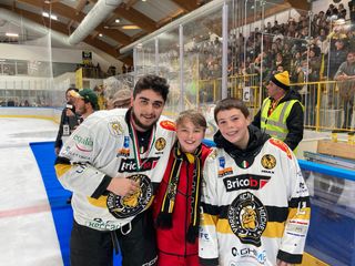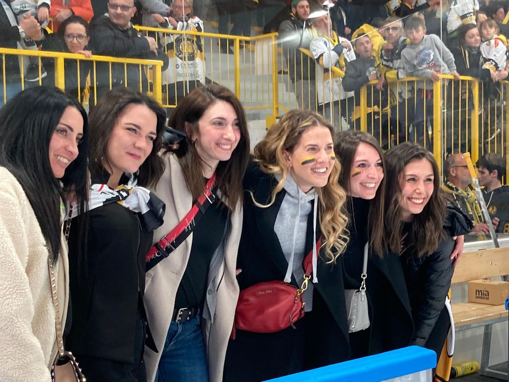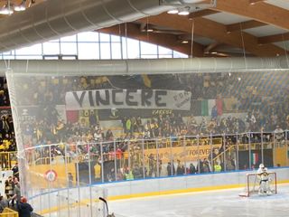 Siamo in diretta: tra poco Mastini sul ghiaccio. Li attende un muro giallonero. Presenti anche una quarantina di tifosi altoatesini con trombe e tamburi. Una coreografia eccezionale attende la squadra di Devèze.