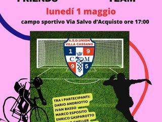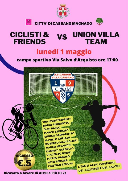 Non poteva non succedere: sportivi l’un contro l’altro armati. Per gioco (locandina completa in fondo). Si sfideranno il Primo Maggio. L’evento recita: “Ciclisti & Friends” contro “Union Villa Team”. Locandina completa in fondo. Volti noti dello sport e glorie locali. Sfondo rosa: ovviamente la partita è tappa verso l’arrivo del Giro, il 20 Maggio. Dalla locandina, nella mischia ci saranno: Dario Andriotto Ivan Basso, Marco Esposito, Enrico Gasparotto, Mavillo Gheller, Roberto Maltagliati, Marco Melandri, Daniele Nardello, Vincenzo Nibali, Marco Parolo, Neto Pereira, Cristian Zenoni. Cronometri puntati sulle 17, al campo di via Salvo D’acquisto, ricavato ad Afpd più di 21.