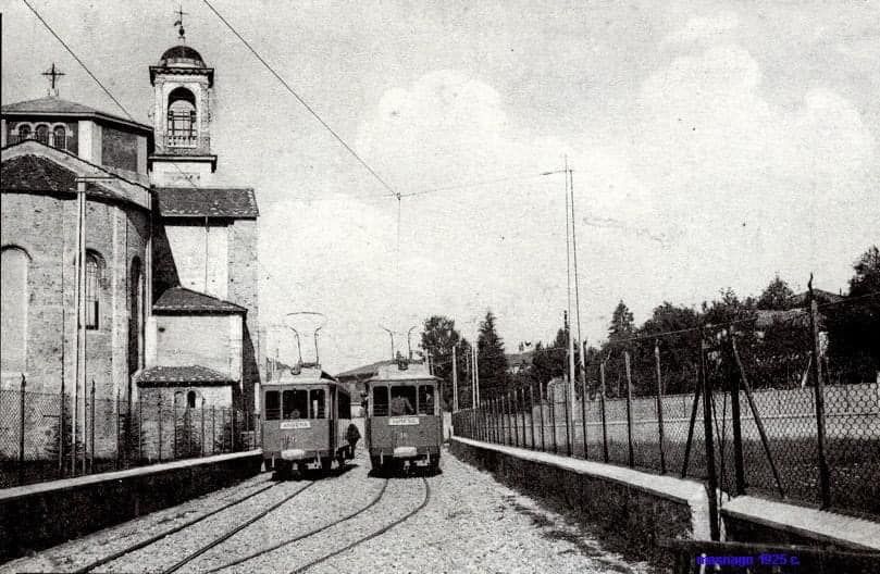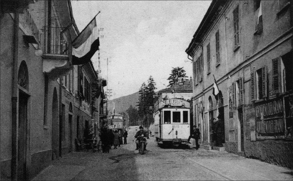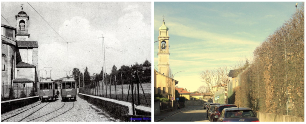 Sono state invece conservate le antiche case di due piani del lato opposto. Dalla piazza Ferrucci transitava, proveniente da via Crispi per dirigersi verso Casciago, anche il tram per Angera. Nella terza foto d’epoca l’incrocio di due vetture, una diretta ad Angera e l’altra a Varese, in un’irriconoscibile via Petrachi, con l’antica chiesa parrocchiale sulla sinistra mentre sul lato destro si estendevano i prati su cui, in seguito, sarebbe stato costruito l’oratorio con il suo campo di calcio.
