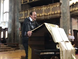 Un excursus pregevole che è proseguito con le pagine che hanno riguardato i dipinti del ‘600, la facciata completata ai primi del Settecento e l’altare maggiore cui s’inizia a pensare a metà Settecento. «Per questo venne chiamato un ingegnere idraulico, Ferdinando Pessina – ha proseguito il relatore – e nel 1750 arriva Biagio Bellotti, pittore, architetto e scultore che propone di affrescare l’abside e completare l’altare. Non sono mancate le critiche come la frase “un’angusta tribuna su una maestosa base” che in realtà è l’opposto». Bellotti affresca dunque la zona bassa con il battesimo di Gesù, tripartito con i discepoli di Giovanni Battista e la Gloria dello Spirito santo. In alto, il catino absidale con la Gloria del paradiso e gli angeli che svelano il paradiso e la volta del presbiterio con la Gloria di San Savino. Indiscutibile l’influsso del Tiepolo che da poco era a Milano.