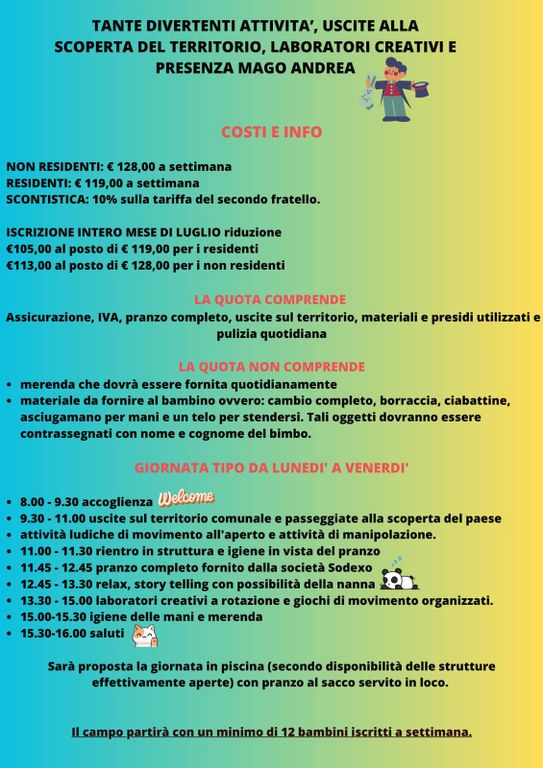 Nel corso delle sei settimane sarà proposta anche la giornata in piscina. Il campo partirà con un minimo di 12 bambini iscritti a settimana.