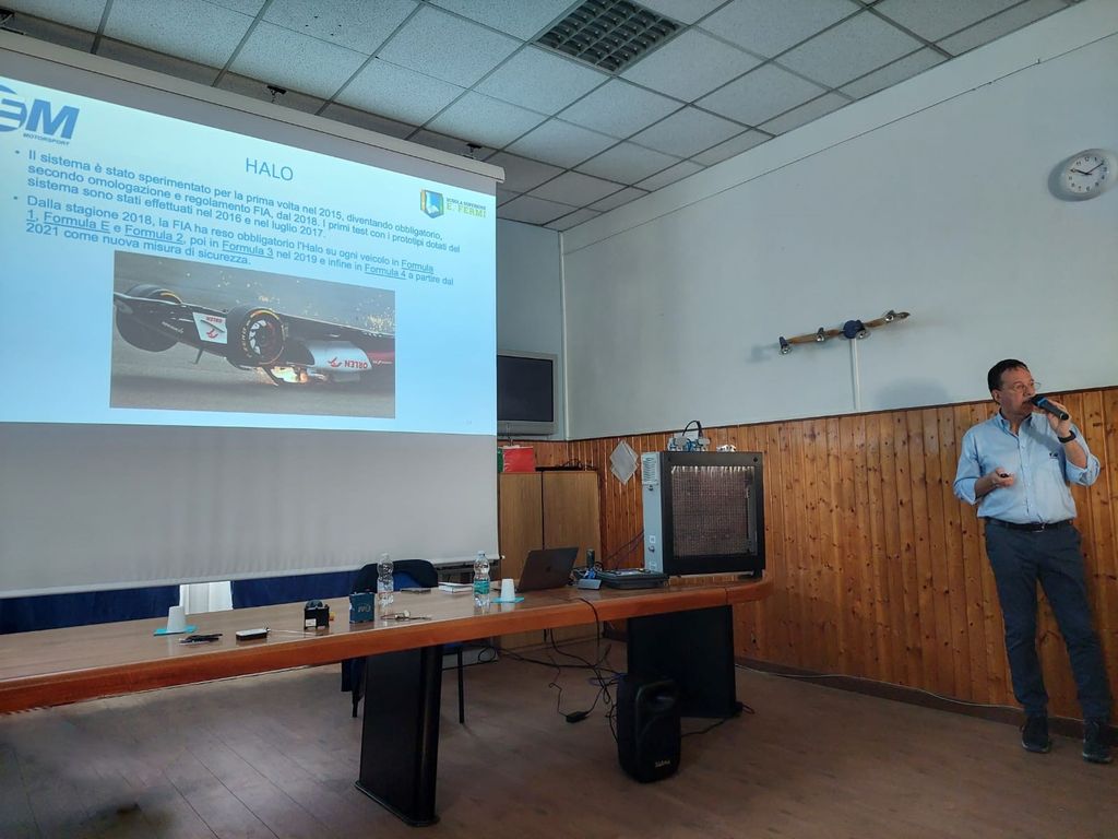 L’incontro con i ragazzi del Fermi è proseguito con la descrizione da parte dell’imprenditore di come funziona il motore di un’auto da corsa, quali i suoi componenti e le dinamiche che permettono alle vetture in gara di raggiungere le altissime velocità a cui siamo abituati.