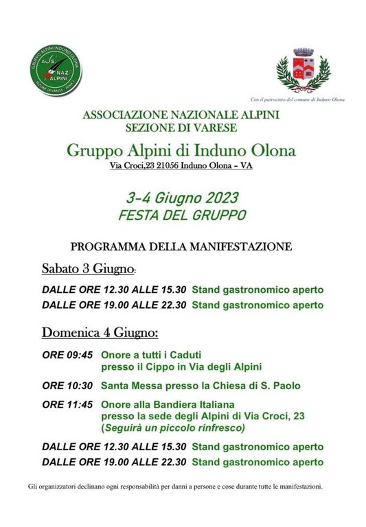 Sabato 3 e domenica 4 giugno torna ad Induno Olona, in via Croci 23, la festa organizzata dal Gruppo Alpini.