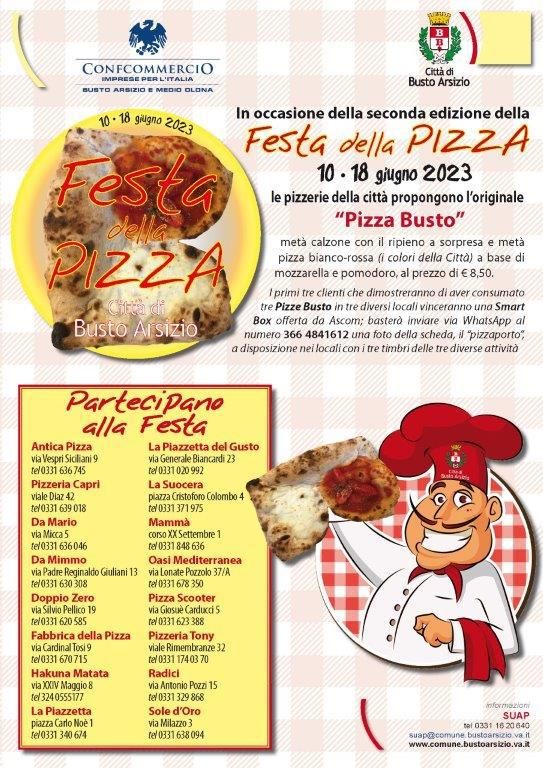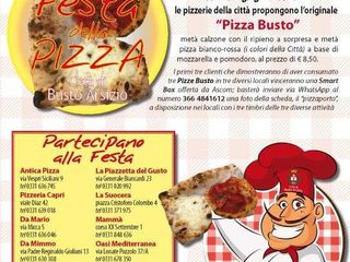 Le 16 pizzerie che partecipano alla festa riproporranno la "Pizza Busto", per metà calzone e per l’altra metà pizza. La metà calzone avrà il "ripieno a sorpresa" scelto da ciascun locale, mentre l’altra metà pizza avrà ingredienti identici per tutti, il pomodoro e la mozzarella.