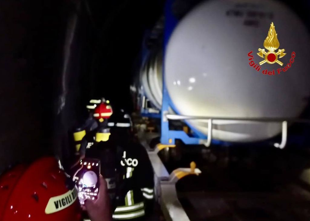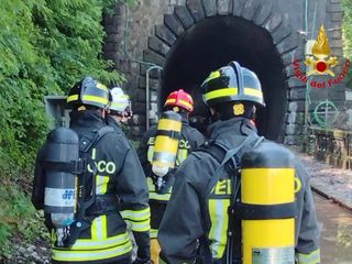 VIDEO E FOTO. Treno merci deragliato per il maltempo: nella galleria del Sasso Galletto di Laveno in azione gli specialisti del nucleo biologico chimico dei vigili del fuoco