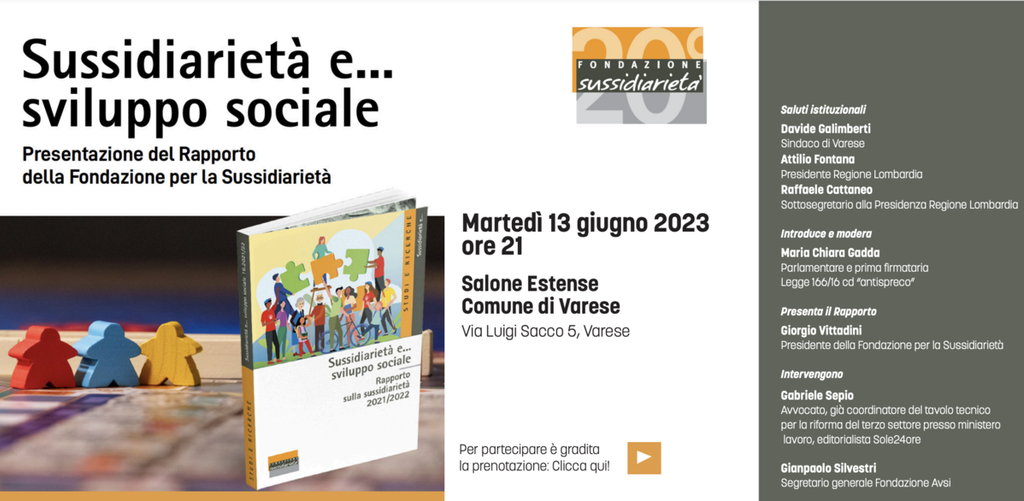 All'incontro, oggi alle 21 nel Salone Estense di via Sacco, intervengono Davide Galimberti, Sindaco di Varese, Attilio Fontana, Presidente Regione Lombardia, Raffaele Cattaneo, Sottosegretario alla Presidenza Regione Lombardia, Maria Chiara Gadda, Parlamentare e prima firmataria Legge 166/16 c.d. “antispreco”, Giorgio Vittadini, Presidente della Fondazione per la Sussidiarietà, Gabriele Sepio, Avvocato, già coordinatore del tavolo tecnico per la riforma del terzo settore presso ministero lavoro, Gianpaolo Silvestri, Segretario generale Avsi.