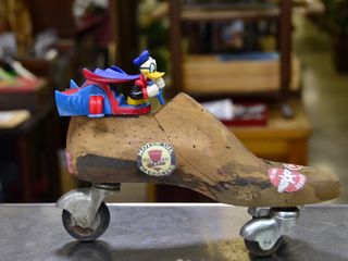 Non basterebbe una giornata intera per vedere le migliaia di oggetti stipati negli scaffali, per terra e anche fuori dal magazzino, Angelo poi si diverte a fare del bricolage mettendo assieme pezzi di giochi Disney con vecchie forme in legno per calzature e fari anni ’50 che servivano, una volta collegati alla presa dell’accendino della macchina, per illuminare il motore magari in caso di guasto.