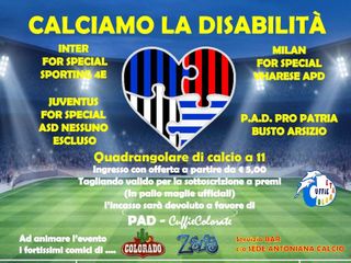 Tutti insieme, un unico grande cuore come urla il manifesto, con un obiettivo: «Calciamo la disabilità». Se le realtà citate sono gli organizzatori, il quadrangolare di calcio a 11 che inizierà alle ore 16, vedrà sfidarsi le squadre paralimpiche, Milan for special Vharese Apd, Inter for Special Sporting 4E, Juventus for Special Asd Nessuno escluso e Pro Patria Pad. Ci si sfida, si sorride con i cabarettisti di Colorado e Zelig e ci sarà il servizio bar alla vicina Antoniana. Il tutto con una missione importante: aiutare i super sportivi ragazzi delle Cuffie colorate, che stanno cercando di comprare casa per l'associazione. LEGGI QUI