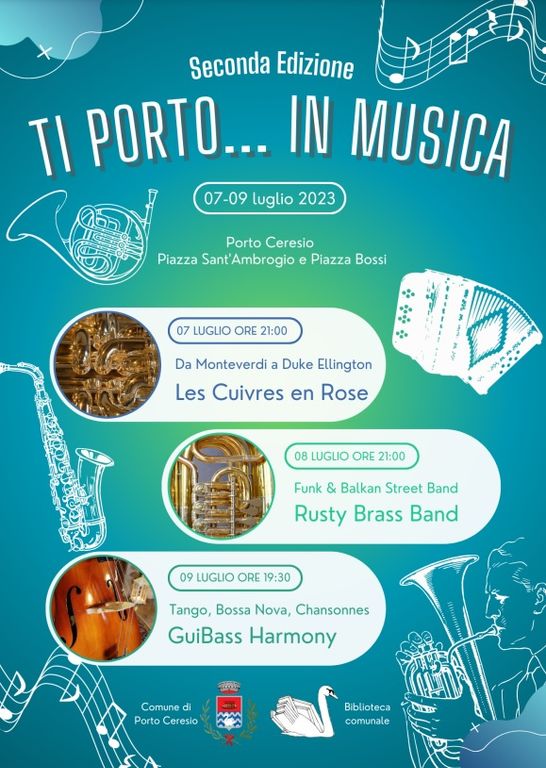 Dopo il successo della scorsa estate, Ti PORTO…in Musica, rassegna musicale promossa e sostenuta dal Comune e dalla Biblioteca Comunale di Porto Ceresio, torna anche quest'anno il 7, 8 e 9 luglio con tre eventi tra piazza Sant'Ambrogio e piazza Bossi.