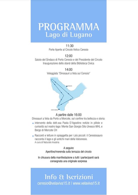 Alle 14 partirà la veleggiata vera e propria, gratuita per tutti i partecipanti, da Porto Ceresio a Morcote. Alle 16, intervento della dottoressa Paola D'Agostino, che racconterà la storia e le curiosità sul monte San Giorgio e sul borgo di Morcote. Parallelamente la biblioteca, in collaborazione con il personale del museo Naturalis Insubria, organizzerà l’intrattenimento per i bambini con il Ceresiosauro e i suoi racconti sugli antichi mari della Valceresio.