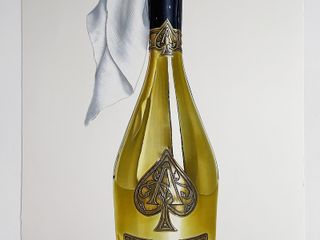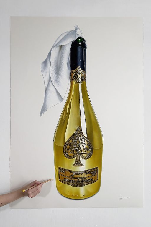 Una bottiglia vuota di preziosissimo champagne “Armand De Grignac” può diventare un simbolo di rivolta, trasformandosi in una molotov pronta a essere accesa, almeno nelle intenzioni pittoriche di Valentina Diena, che il “brut” francese dal costo di 300 euro ha riprodotto su carta in maniera magistrale, in un’opera 76x112 dal titolo “Feeling good”.