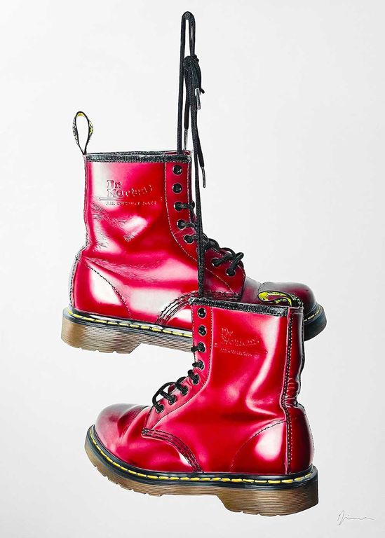 «Mi spinge una sorta di percezione attrattiva, mi attirano i colori, la texture, i riflessi che già immagino disegnati. Scelgo oggetti che mi comunichino matericità, come le pieghe della pelle o del nastro adesivo, il vetro del dispenser, la stessa etichetta della bottiglia di champagne. Lavoro ore e ore sui dettagli. Alcuni oggetti contengono un significato particolare, parte della nostra memoria collettiva, oppure, come nel caso delle “Dr. Martens”, sono un brand riconosciuto, così come il “balloon dog” è un simbolo dell’arte contemporanea, ha un’identità granitica e grande forza comunicativa».