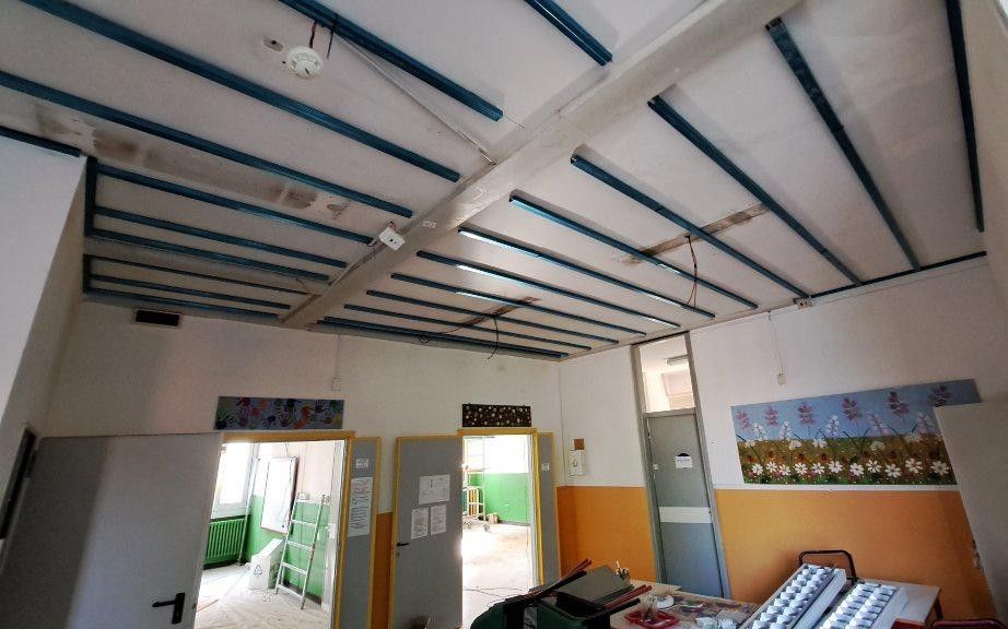 È infatti in stato avanzato la rimozione delle controsoffittature esistenti, per la successiva posa dei nuovi controsoffitti modulari antisfondellamento nei corridoi e nelle aule, e la sostituzione dei corpi illuminanti con pannelli a led, a minor consumo energetico.