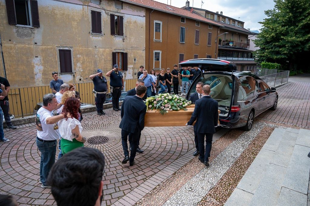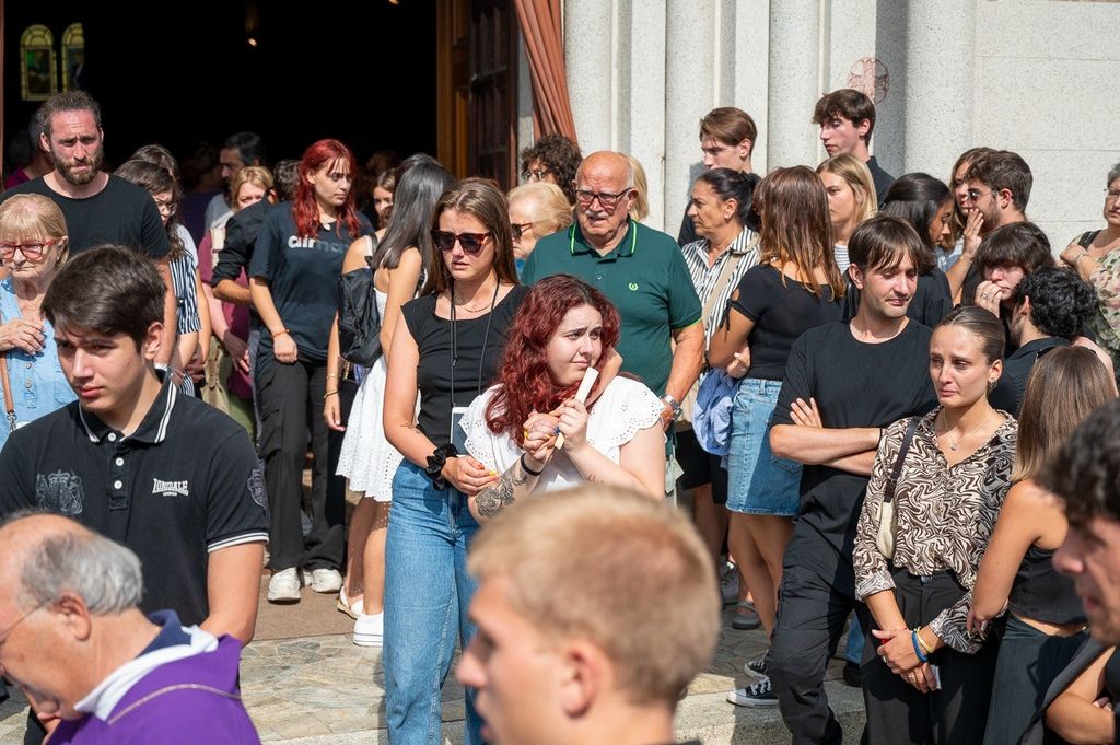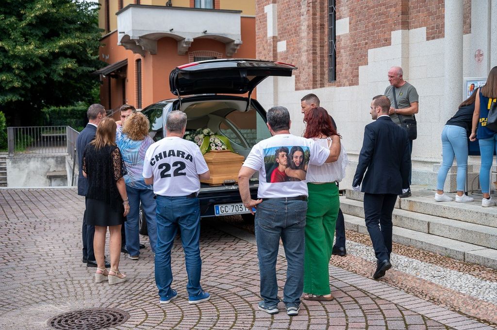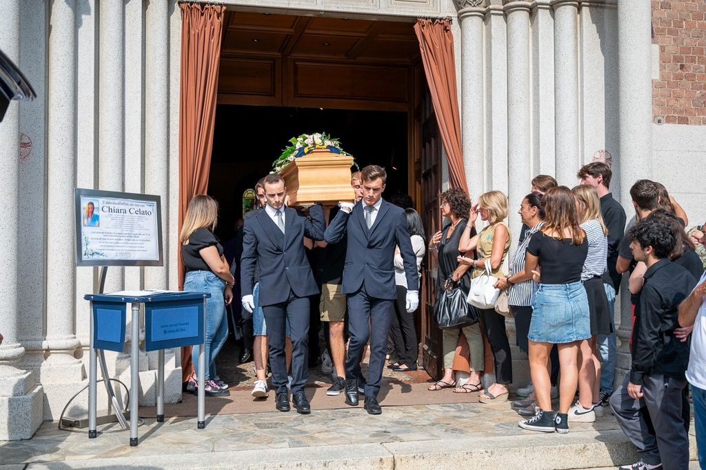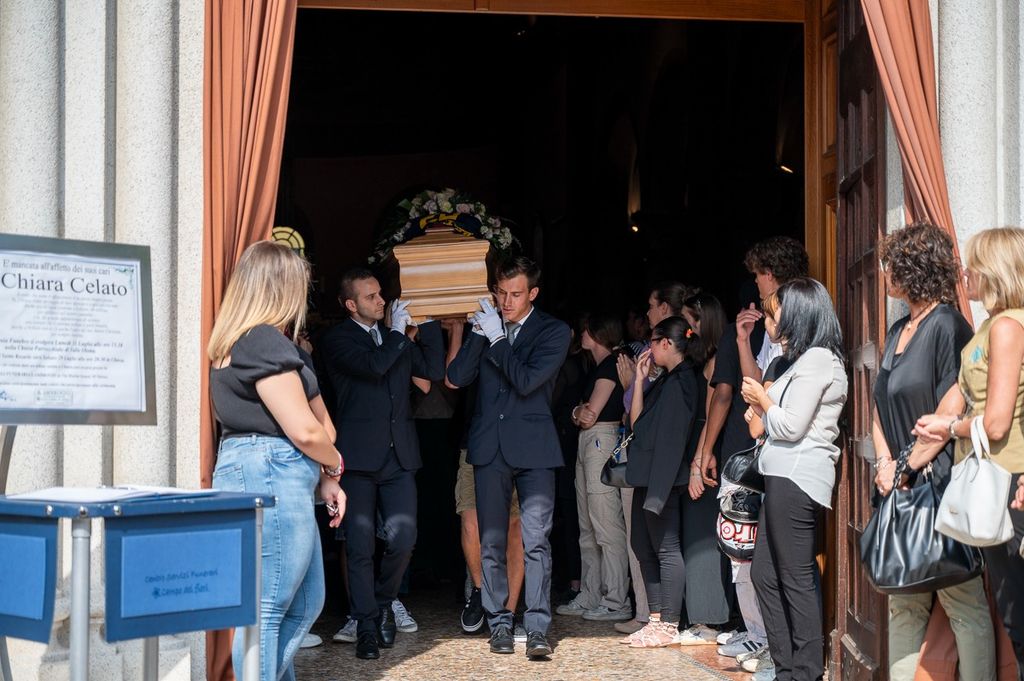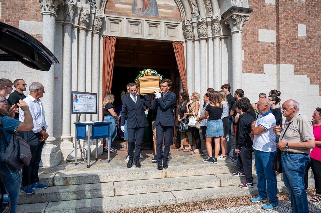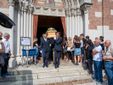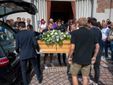 L'uscita dalla chiesa di Valle Olona della bara di Chiara, coperta dai fiori e dalla maglia della sua squadra di pallavolo (Foto di Alessandro Galbiati)