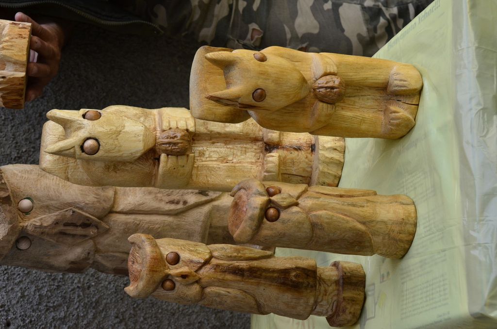 Sotto a un portico ha allestito un tavolo da osteria con i giocatori di carte, mentre intorno c’è chi costruisce le gambe delle sedie e chi sgrana il granturco, con gli attrezzi originali rinvenuti nelle cascine della valle, né manca un Fabio Maccario in legno di castagno vecchio, seduto davanti alla porta di casa, con cappello e sciarpetta e un secchio in mano.