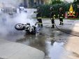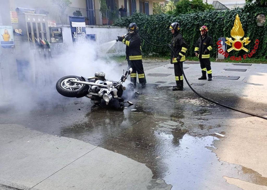 FOTO. Fa benzina al distributore e la moto prende fuoco: motociclista ustionato a Luino