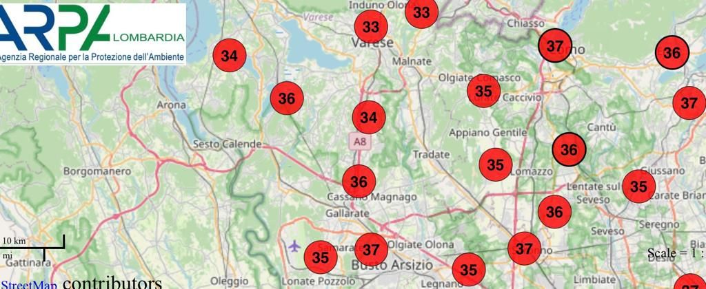 Secondo la mappa delle temperature in tempo reale di Arpa Lombardia (clicca QUI), oggi in provincia di Varese si sono registrati picchi tra 36° e 37°, sia a sud che a nord: si va dai 37° di Lavena Ponte Tresa ai 36.8° di Busto, dai 35.7° di Varano Borghi ai 35.4° di Porto Ceresio, dai 36.4° di Cavaria ai 34.7° di Cuveglio, dai 35.6° di Ferno ai 33.8° di Arcisate, dai 34.7° di Laveno Mombello ai 35.8° di Castronno e ai 34.4° di Ispra. Nel centro di Milano, sempre secondo Arpa, si sono registrati 38.2° in piazza Zavattari, in zona piazzale Lotto-San Siro.