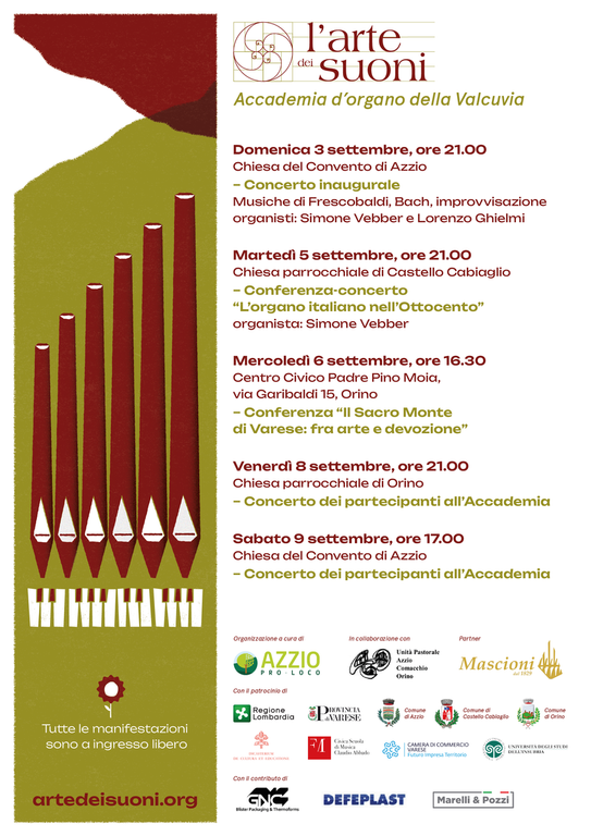 Il progetto che ha come capofila la Pro Loco di Azzio in collaborazione con la Comunità Pastorale di Azzio, Comacchio e Orino, gode dei patrocini di Regione Lombardia, Provincia di Varese e dei Comuni di Azzio, Orino e Castello Cabiaglio oltre che del Dicastero per la Cultura e l’Eduzione dello Stato del Vaticano, della Camera di Commercio di Varese, della Civica scuola di Musica Claudio Abbado e dell’Università dell’Insubria.