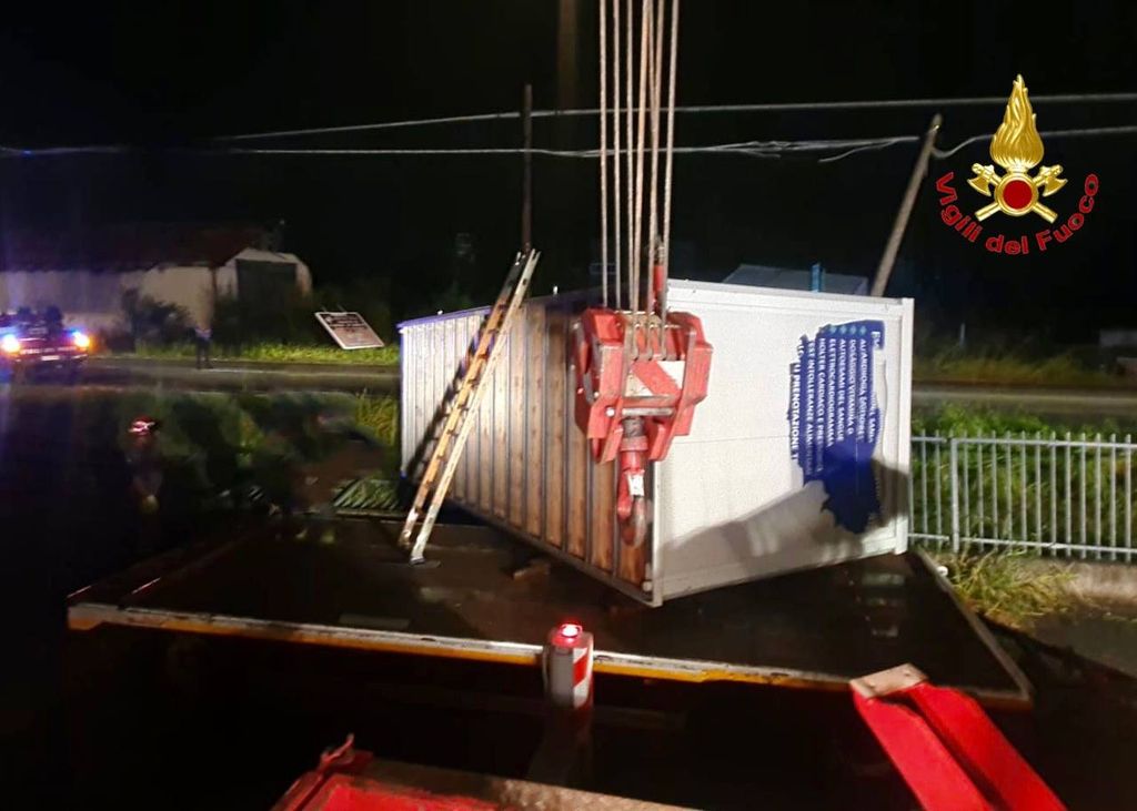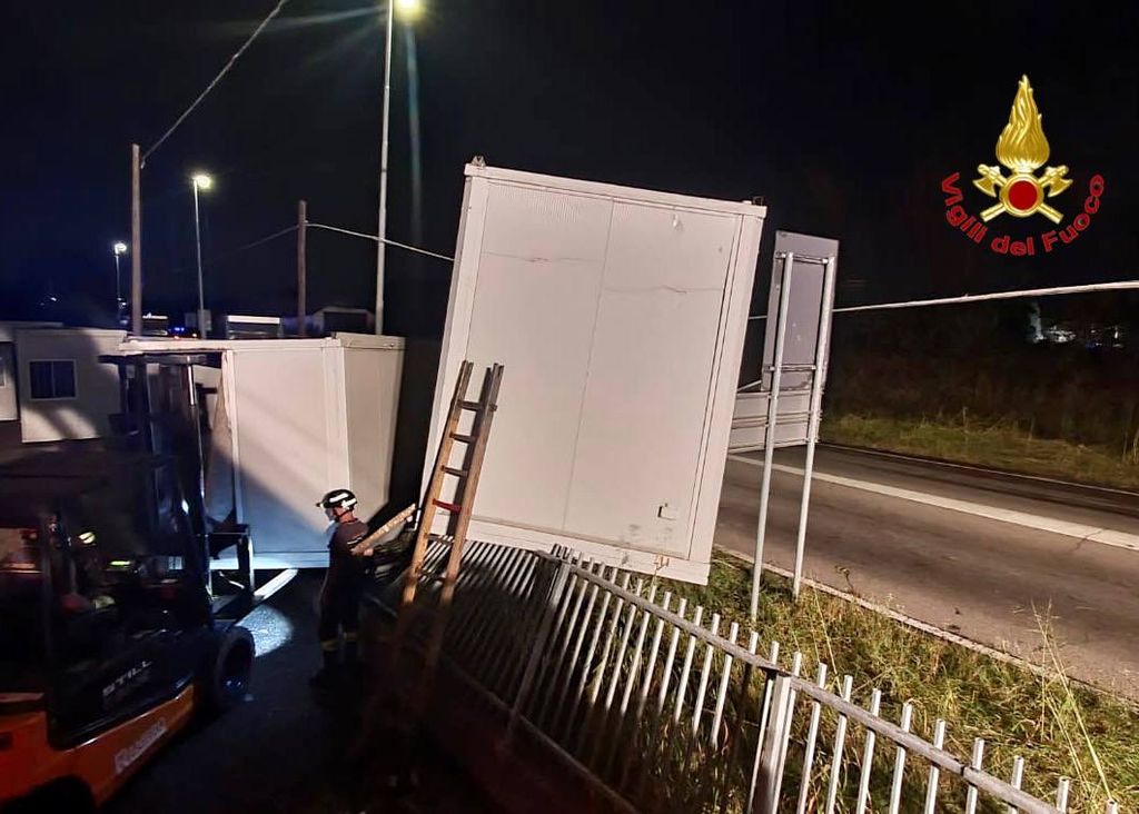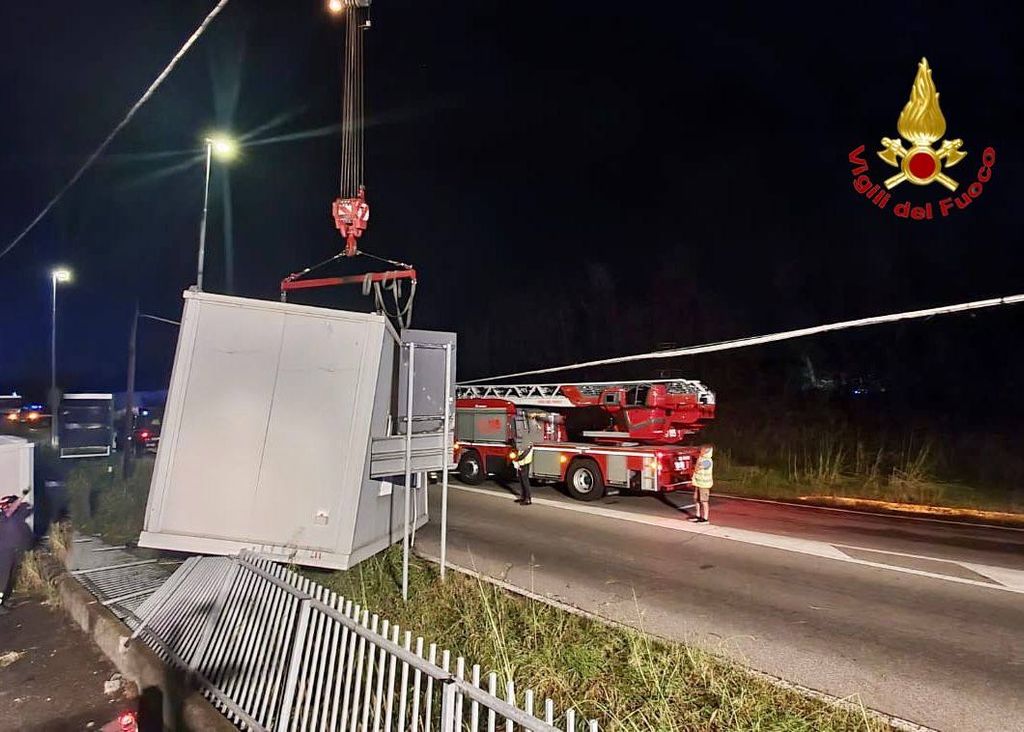 FOTO. Maltempo, volano in strada i container di una ditta e abbattono alcuni pali: danni a Uboldo