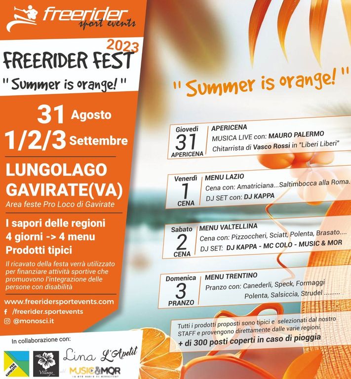 Da domani, giovedì 31 agosto, a domenica la Pro Loco Gavirate colorerà di arancio il lungolago per mettere in scena “Freerider Sport Events Fest”, manifestazione con ricavato a favore dell’associazione varesina che insegna lo sci alpino e il wakeboard alle persone con disabilità motoria.