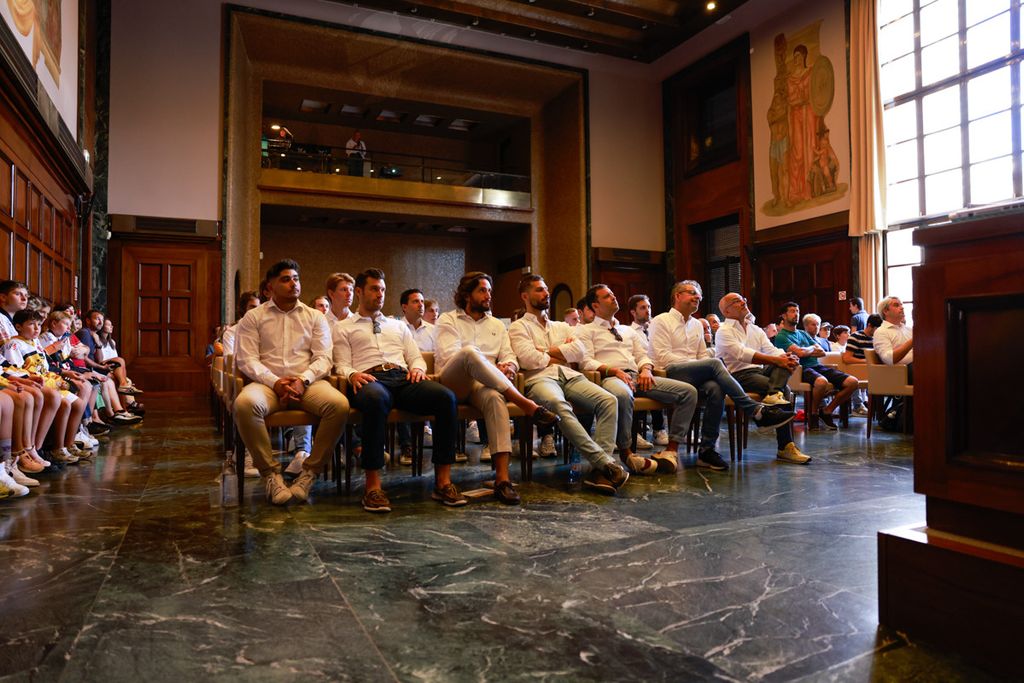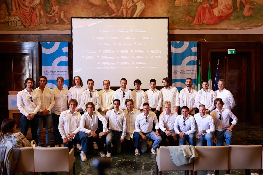 I giocatori sono poi stati chiamati uno a uno sul palco da Max Airoldi, applauditissimi: «Con il numero 2 Rocco Perla, con il 31 Lorenzo Marinelli, il numero 90 Leonardo Mordenti. In difesa con il numero 3 Andrea Schina, il 4 Michele Vignoli, il 5 Erik Naslund, il 7 Nicolò Fanelli, il 18 Felix Garber, il 22 Erik Mazzacane, il 69 Alex Bertin. In attacco con il numero 9 Kyle Gibbons, il 13 Tommaso Cordiano, il numero 16 Andrea Vanetti, il numero 15 Gianluca Tilaro, il 23 Marcello Borghi, il 27 Michale Mazzacane, il 32 Pietro Borghi, il 42 Fillippo Crivellaro, il 19 Sebastian Allevato, il 55 Alessio Piroso, il 77 Massimo Pietroniro, l'87 Dennis Perino, il 91 Edoardo Raimondi. E il coach Niklas Czarnecki».