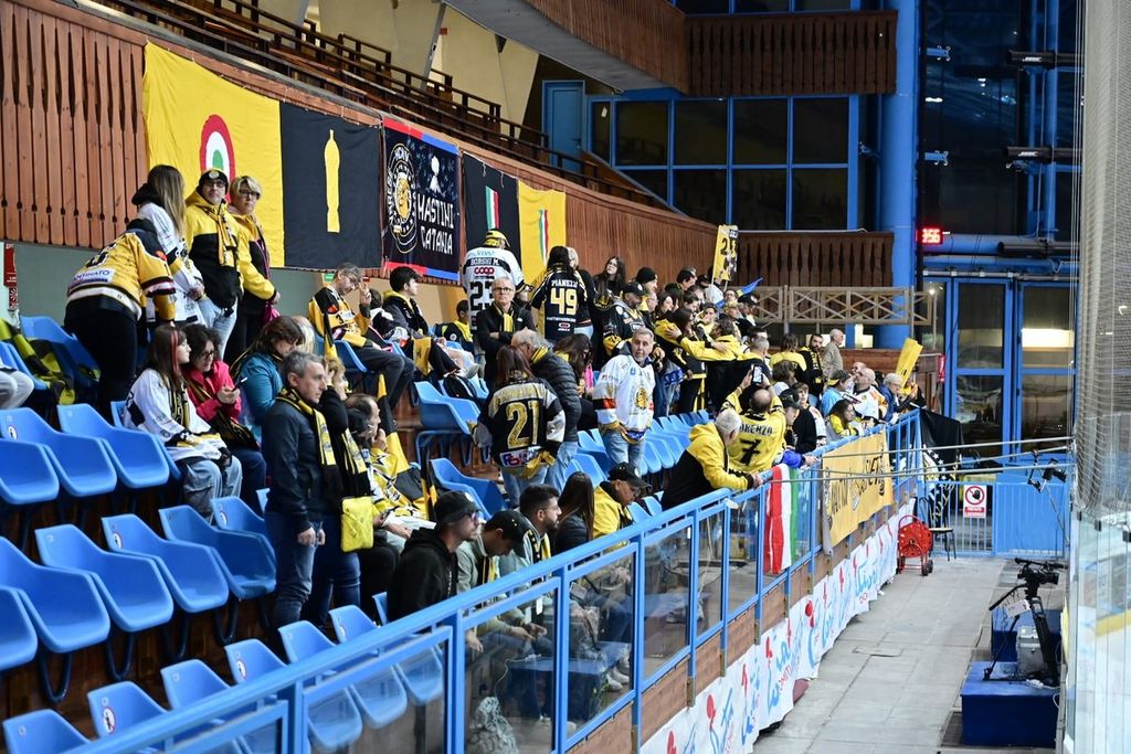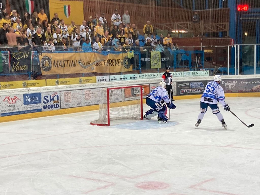 Ambiente da brividi in questo spettacolare anfiteatro di ghiaccio dove echeggiano i cori di almeno 200 tifosi gialloneri, giunti con tre pullman e una lunghissima carovana d'auto nella Perla delle Dolomiti per sostenere il Varese in un'impresa definita da qualcuno impossibile.
