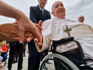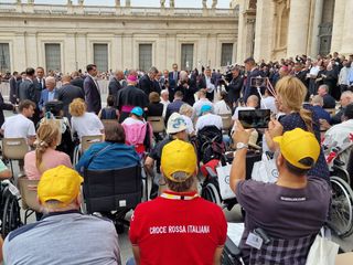 È arrivato il Papa, e mentre transitava a pochi metri da noi tutti, molti occhi hanno cominciato a lacrimare per l’emozione. Ma non è finita qui. Terminata l’udienza il Santo Padre, sceso dall’altare si e mosso verso coloro che erano li presenti ed è passato in carrozzina dando la mano a ciascun ospite.