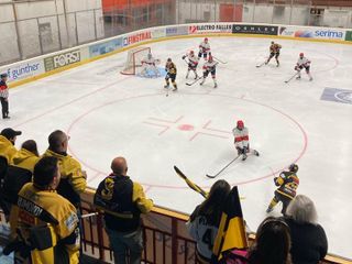 La partita finisce in un secondo tempo marchiato a fuoco dall'assedio giallonero (8 conclusioni a 0 nei primi 6 minuti): si sposta l'asticella quando Gibbons, che ci stava provando da due partite e un tempo e aveva raggranellato ben tre pali, trova l'angolino sull'assist di Andrea Vanetti, mai così concreto e uomo-squadra come in questo inizio stagione. Poi Marcello Borghi conclude un power play magistrale con un delizioso e spiazzante tocco sotto porta su un'altra sassata di Gibbons, quindi piazza il 3-0 da principe del gol. Dopo è show dell'attaccante straniero giallonero in arrivo dall'Ohio e dall'Alps: altre due reti, la seconda da saltare sulla sedia, in una frazione da veri "campioni". I tiri, che dopo 20 minuti erano quasi in parità, s'ingrossano come il fiume in piena giallonero: 29 a 17.