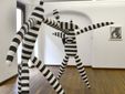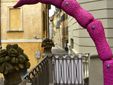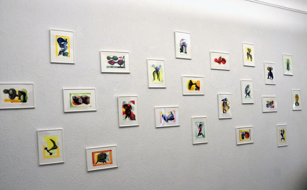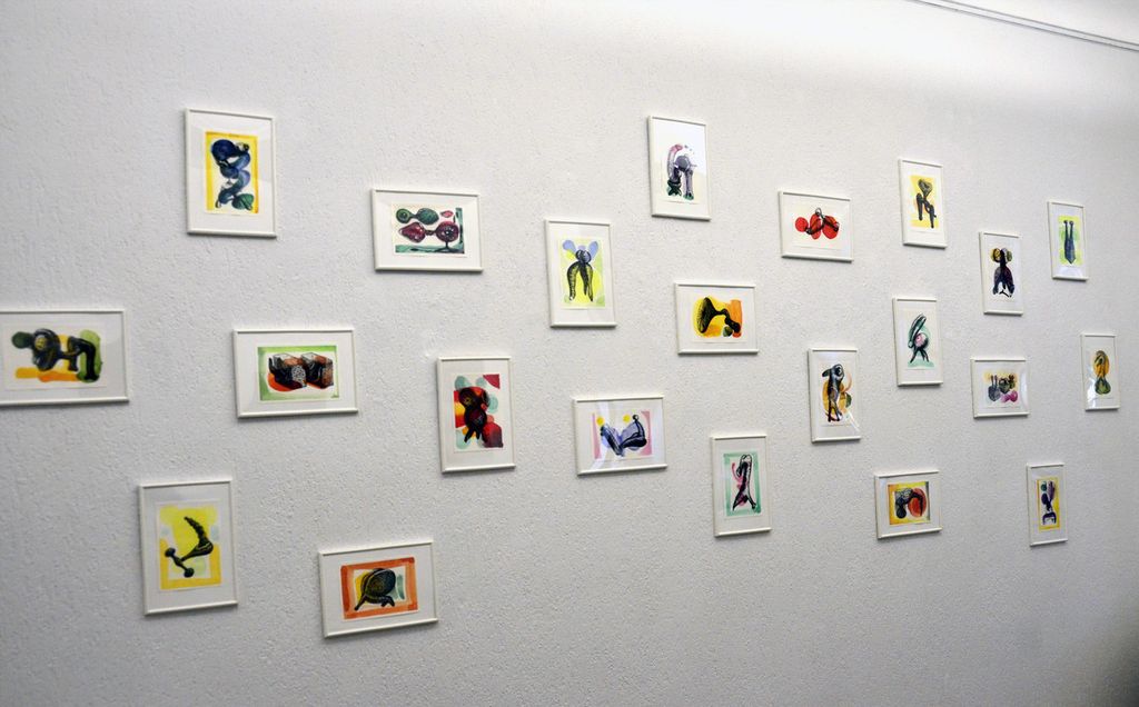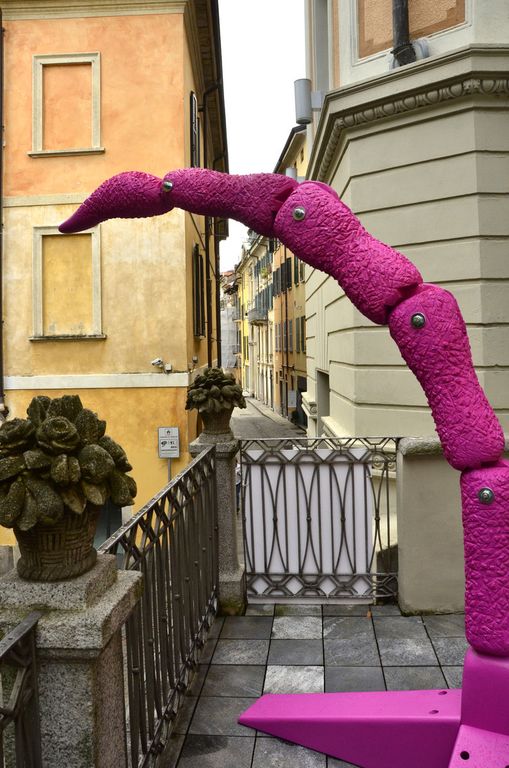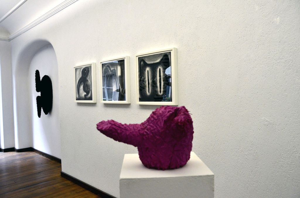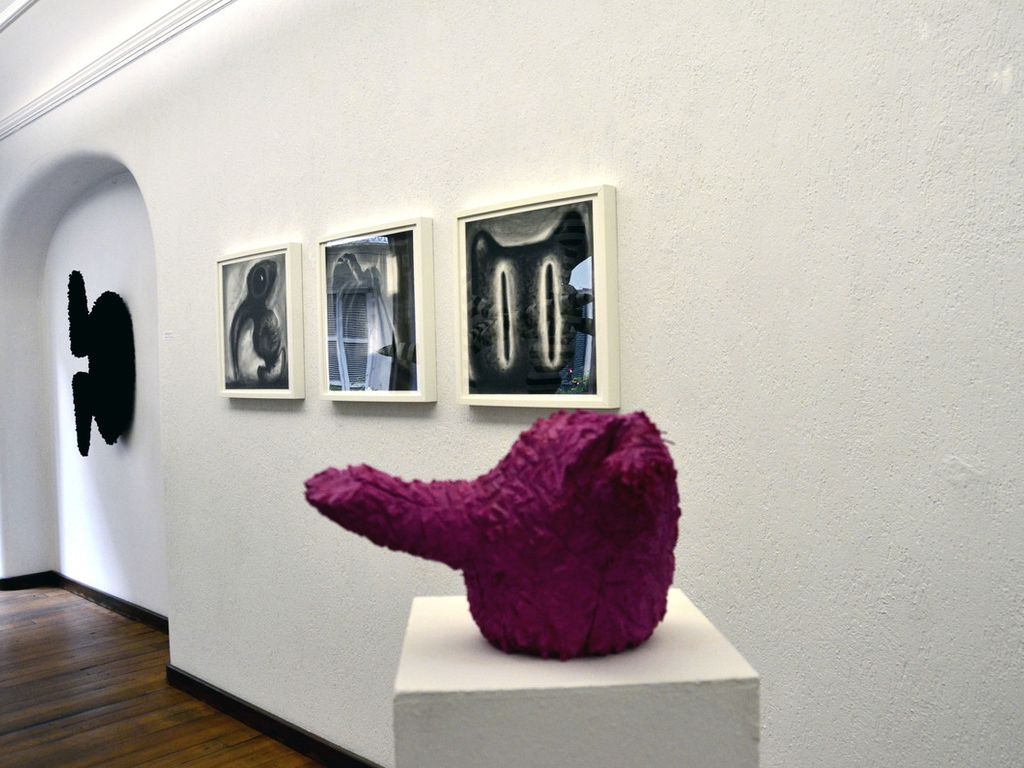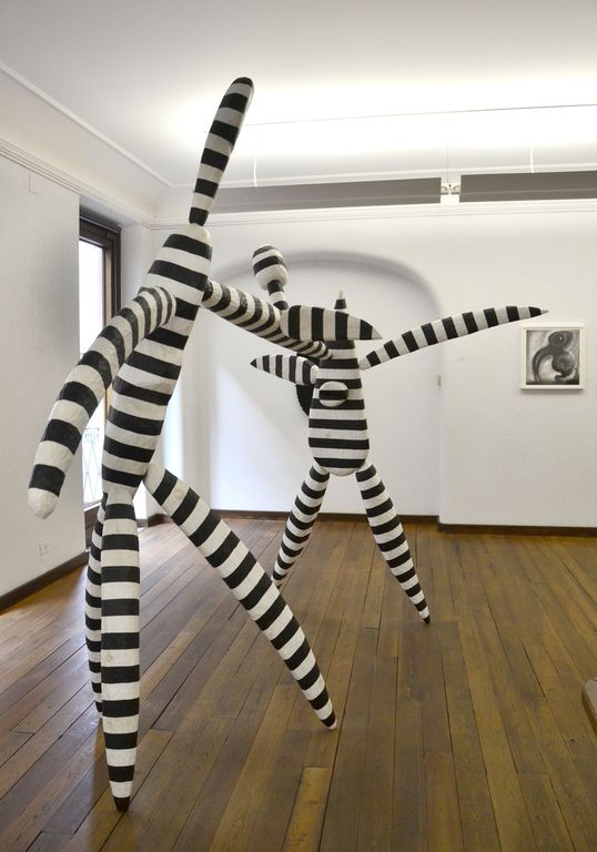 Un lunghissimo “Finger of Goddess” dito della dea, di un rosa acceso, realizzato in lamellare di pino e acrilico, svetta sul balcone dalla galleria, visibile già da via Leopardi, preludio alle opere esposte nella sale, con il gigantesco “Sciamano” in legno di cirmolo e acrilico bianco e nero a dare il benvenuto ai visitatori, e i lavori più piccoli affiancati da numerosi acquerelli e ad altri studi preparatori realizzati a carboncino.