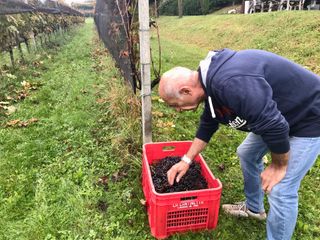 Poco più in là delle viti oggetto di raccolta, l’enologo Giovanni ci mostra anche le barbatelle, ovvero le piantine ancora in divenire. Sono di una varietà di uva rossa chiamata Manzoni: per ottenere una bottiglia di vino bisognerà aspettare minimo quattro anni.