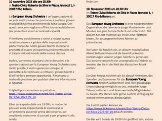 La European Young Orchestra è un’organizzazione di recente costituzione che promuove e sostiene giovani musicisti di talento provenienti da tutta Europa. Il concerto sarà una preziosa occasione per presentare le loro eccezionali capacità musicali.